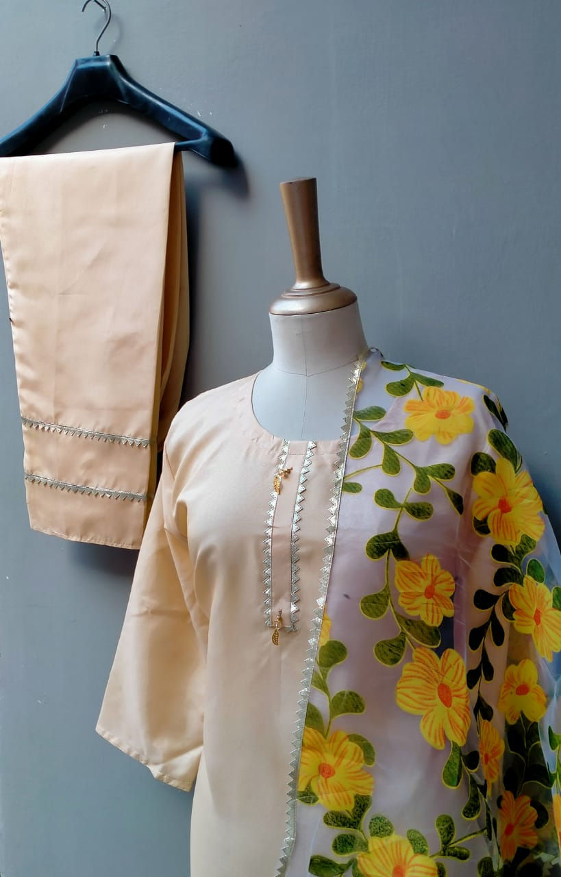 3 PC Summer Silk Kattan Frock With Organza Dupatta 4002